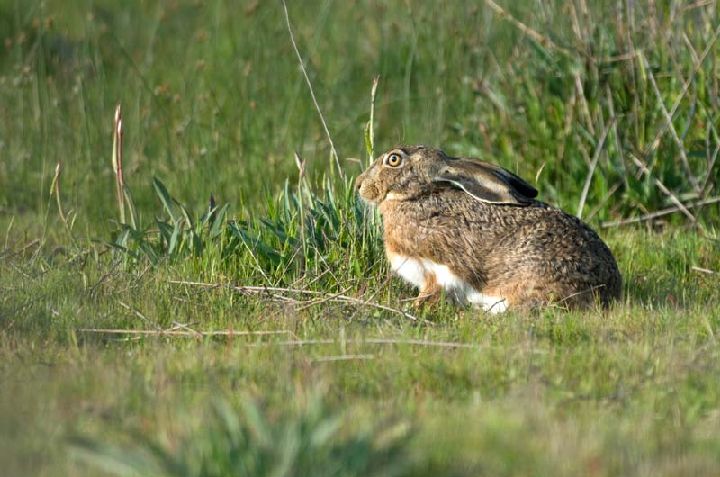 Liebre europea (Lepus europaeus). Se da en la práctica totalidad de Europa (hasta el noroeste de la Península Ibérica). Su peso se puede elevar hasta los 4 kg, con un contraste menor entre las tonalidades de su pelaje en el vientre y dorso, debido a un área de transición en pardo o grisáceo.