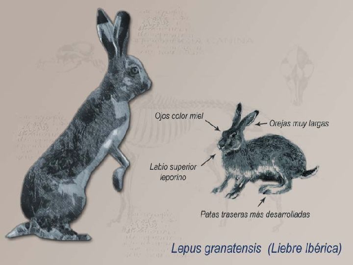 Liebre ibérica (Lepus granatensis). Muy extendida, pero tan sólo se encuentra en España y Portugal. De pequeño tamaño (alcanza los 2 kg), con características manchas blancas en sus extremidades y vientre.