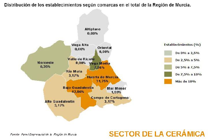La azulejería es otro sector referente, presente sobre todo en Lorca y Totana donde se siguen utilizando técnicas milenarias y algunas heredadas de los musulmanes. En la diputación de Valentín, entre Cehegín y Calasparra, existen industrias de barro cocido destinado a la construcción. Estos materiales se han empleado en la Región de Murcia para la edificación de monumentos emblemáticos como el Monasterio de los Jerónimos de Guadalupe o la Iglesia de Santo Domingo en la capital.