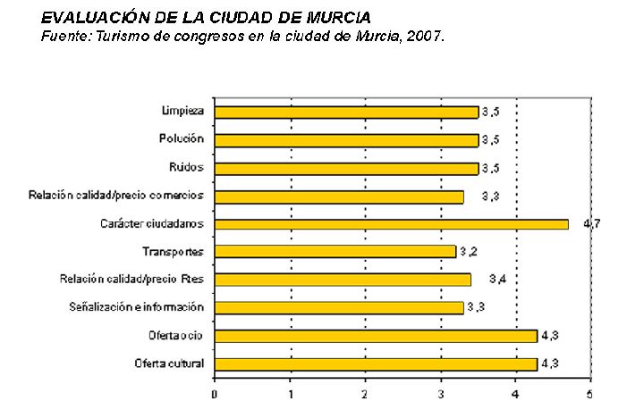 Según los datos ofrecidos por la Oficina de Congresos de Murcia, durante el año 2008 se celebraron en la ciudad 1.041 reuniones, 56 congresos, 139 convenciones y 846 jornadas, con una participación total cercana a los 345.000 asistentes.