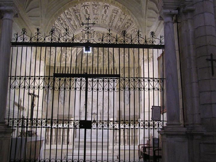 Alrededor del altar evolucionan los elementos más destacables de la capilla. La cubierta es una bóveda elíptica formada con segmentos de una abigarrada ornamentación de candelieri y grutescos en los que aparecen con frecuencia, incluso, imágenes demoniacas. En el centro de esta bóveda se abre un óculo rodeado de una guirnalda de flores y frutos muy parecida a las que se encuentran en la cúpula de la sacristía de la Catedral. Los paños de la bóveda están compuestos de columnas en las que se intercalan pequeños nichos que dan cobijo a 14 figuras escultóricas realizadas en 1594 por Juan Pérez de Artá y Cristóbal de Salazar. Las figuras corresponden a seis sibilas y los profetas Juan 'Bautista' e Isaías, que quedan ya flanqueando la Adoración del altar. La sibila es una figura mitológica de la Antigüedad, que fue retomada en el Renacimiento, siendo frecuente su representación incluso en temas sagrados ya que se asociaban a la profecía y solían representarse, muchas veces, junto a los profetas bíblicos. El neoplatonismo, cuyas ideas enraizaron en muchos artistas renacentistas italianos, es en parte responsable de esta mezcla de herencias culturales; el cristianismo no debía sustraerse a la herencia grecolatina y la hace a ésta partícipe de la revelación cristiana. La pared del altar que cubre esta curiosa bóveda muestra también, como la entrada, un arco de medio punto en cuya luz queda una curiosa representación del mundo angélico, un altorrelieve de ángeles que parecen sumarse al acontecimiento que se sucede por debajo de ellos, la Adoración de Jesús por los ángeles. El suelo de la capilla está cubierto con cerámica vidriada y las correspondientes placas de mármol que cierran la cripta y entre las que se pueden leer la sentencia: "AQUÍ VIENE A PARAR LA VIDA".