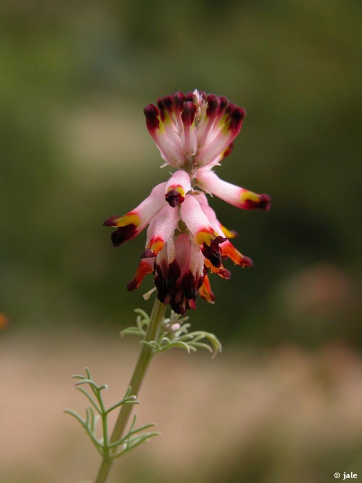 Una especie próxima, aunque más rara, es Platycapnos spicata (véase fotografía), con tonalidades anaranjadas en las flores, inflorescencia subglobosa y alargada, nunca de aspecto piramidal y foliolos varias veces divididos y marcadamente lineares.