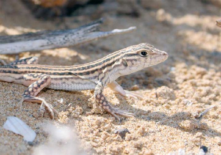 Curiosidades: Los dedos presentan expansiones de las escamas en su cara ventral y en el borde externo, lo que hace más extensa la superficie que la sustenta sobre la arena, impidiendo que se hunda. Esto le da ventaja sobre sus presas y sus predadores en un sustrato, la arena, tan móvil y cambiante.