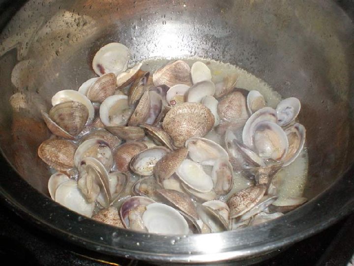 Una vez doraditos los ajos añadimos las almejas escurridas y esperamos que se abran.