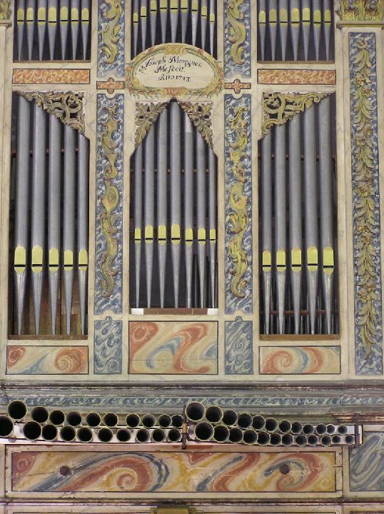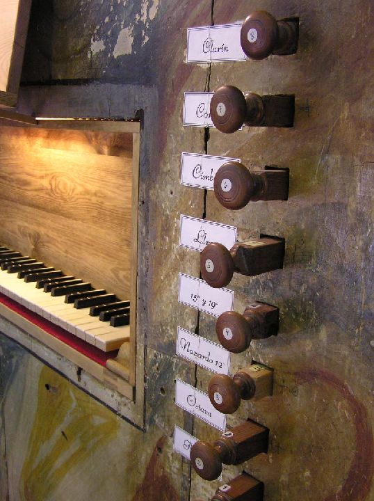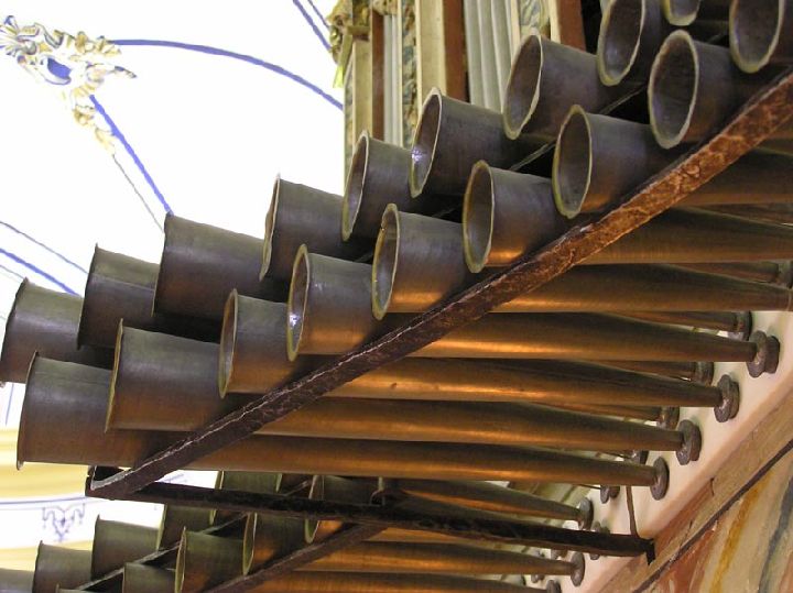 Los tubos de los tres castillos centrales superiores están dispuestos en forma de mitra y son canónigos.