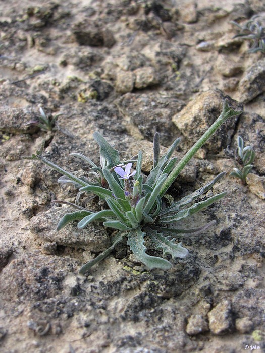 Pequeña planta anual de 5-30 cm de altura. Hojas sin peciolo, anchamente linear-lanceoladas, profundamente lobuladas, de margen no recto, algo ondulado, verde grisáceas, cubiertas por una fina lanosidad. Flores agrupadas en número reducido al final de los tallos, pequeñas, de cuatro pétalos, de color violáceo. Fruto de tipo silicua (cápsula alargada), con dos protuberancias laterales en su extremo, a modo de cuernos.