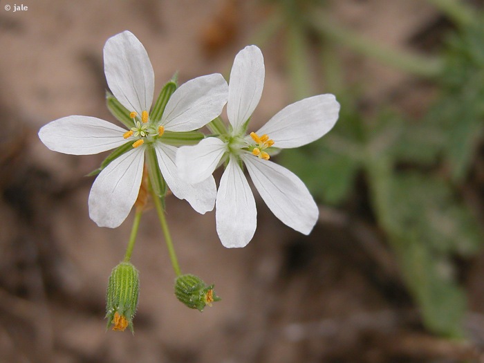 Hierba anual, rara vez bianual, de hasta 70 cm de altura. Tallos de postrados a erectos, cubiertos de pelos cortos y glándulas. Hojas ovadas, a veces 3-5 veces lobuladas, crenadas o dentadas, con estipulas triangulares, membranosas. Flores actinomorfas (de simetría radial), de cinco piezas, pétalos rosado-violáceos, anteras purpúreas. Fruto tipo esquizocarpo, que se abre en 5 piezas o mericarpos, con aristas.