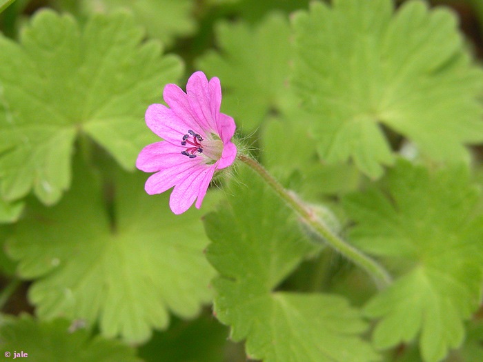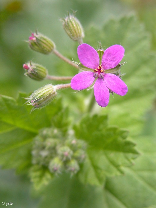 Hierba anual, rara vez bianual, de hasta 70 cm de altura. Tallos de postrados a erectos, cubiertos de pelos cortos y glándulas. Hojas ovadas, a veces 3-5 veces lobuladas, crenadas o dentadas, con estipulas triangulares, membranosas. Flores actinomorfas (de simetría radial), de cinco piezas, pétalos rosado-violáceos, anteras purpúreas. Fruto tipo esquizocarpo, que se abre en 5 piezas o mericarpos, con aristas.