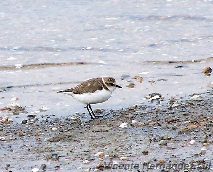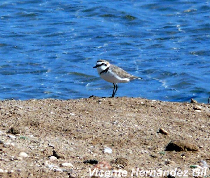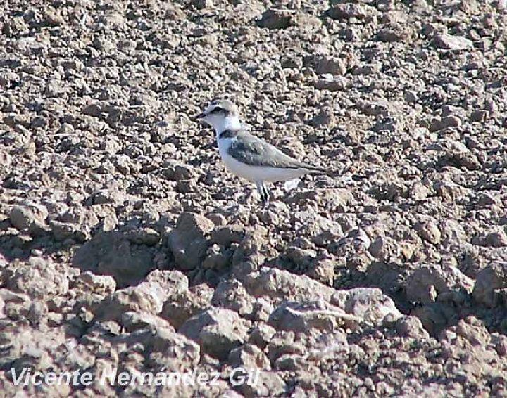 El plumaje de su cuerpo se caracteriza por el contraste entre el blanco de su pecho y vientre y el color pardo leonado del dorso y las plumas escapulares, observándose un collar a veces incompleto de color negro, que se interrumpe en la garganta. Además son muy características las manchas oscuras de la frente y del ojo, como máscara, que no llegan a contactar.