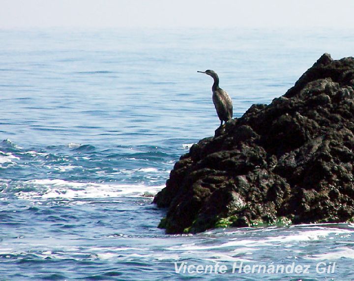 El cormorán moñudo es completamente negro, destacando las plumas levantadas del píleo que le dan su nombre vulgar.
