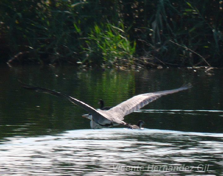 Posee un vuelo muy potente y planeado, manteniendo las patas extendidas y el cuello encogido, pudiéndose observar, también, un contraste en el color de las plumas remeras de las alas ya que son de un color gris bastante más oscuro que el del resto del cuerpo.