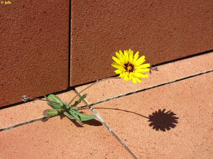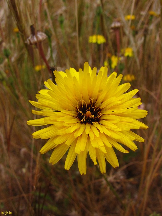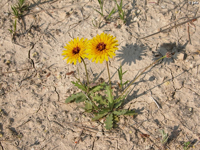 Hierba anual (en ocasiones perennizante), glabla, habitualmente de 15-35 cm de altura. Hojas 5-10, en roseta basal, lanceoladas, de enteras a pinnatisectas, con dientes, verde azuladas, con frecuencia con tonalidades pardo-rojizas, nerviación más clara, verde glauca. Tallos pardo-rojizos, con hojas caulinares muy reducidas y escasas. Capítulo con involucro de 2-3 filas de brácteas oval- lanceoladas, que presentan margen escarioso y terminan en extremo agudo. Flores todas liguladas, del doble de la longitud del involucro, amarillas, con la base manchada de purpúrea. Fruto seco de tipo aquenio, verrucoso, con vilano a modo de corona.