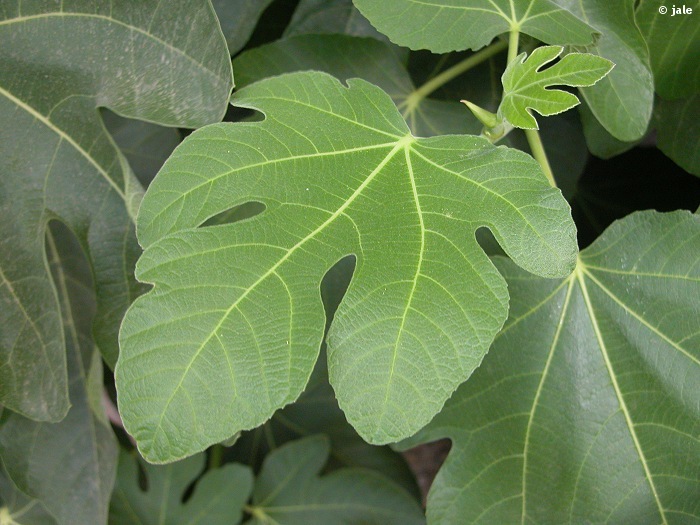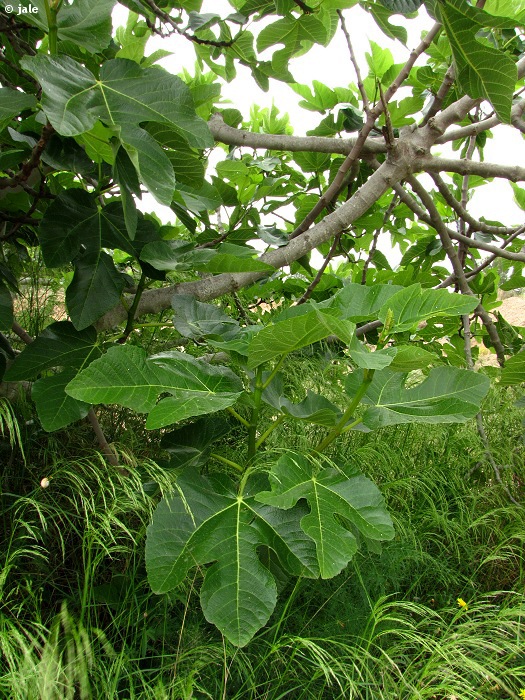Árbol dioico de hasta 5 m, copa redondeada y amplia, tronco grueso, corto y grisáceo. Hojas caducas, grandes, habitualmente mayores de 20 cm de longitud, con peciolo largo, palmeadas, de lóbulos profundos, ásperas, con haz verde oscuro y envés más claro, tomentoso, de nerviación marcada. Flores muy pequeñas, encerradas en el interior de un receptáculo carnoso denominado sicono, presente en las axilas, generalmente solitario o en pares. El sicono presenta un único orificio, muy estrecho, por donde debe acceder el polinizador, muy específico, una pequeña abeja del género Blastophaga. Fruto carnoso, con forma de pera o globoso, que presenta estrías cuando madura: el higo.