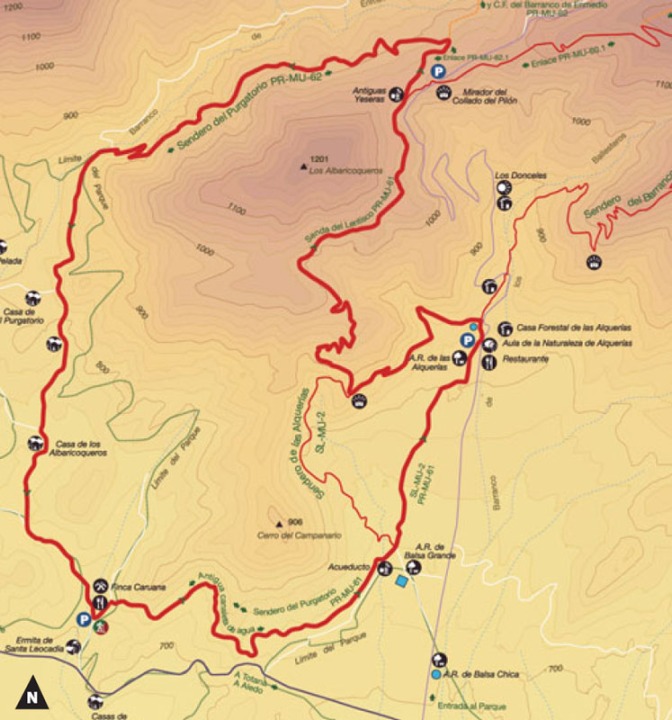 Entre un denso pinar con bellos ejemplares de encinas y quejigos, descenderemos por el PR-MU 62 sobre un cómodo sendero de mampostería hacia el Purgatorio. Hay que recordar que dicho PR sigue ascendiendo en dirección al collado Bermejo, pasando antes por la Casa de la Carrasca. Nosotros lo tomaremos en descenso hacia la Finca Caruana. Al llegar a la pista forestal, atravesaremos la puerta que delimita el parque, siendo prudentes de dejarla cerrada tras nuestros pasos.