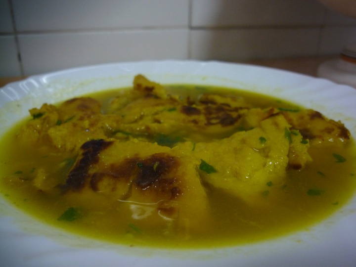 Se pasa todo a un recipiente mayor y se le añaden 2 litros de agua (templada o caliente) con el fuego más fuerte. Observaremos cuando comienza a hervir que la tortilla se esponja, eso es señal que todo va bien. Es el momento de añadir el azafrán o el colorante y una pizca de comino en polvo. El proceso de cocción tardará aproximadamente 45 minutos.