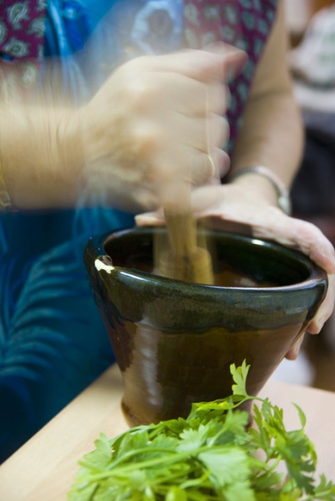 Una vez se ha cocido se parte a trocitos un diente de ajo, se echa al mortero y se le añade un poco perejil también troceado. Se pica todo y se le añade a la tortilla que todavía estará hirviendo. Se remueve un poco y listo para servir.