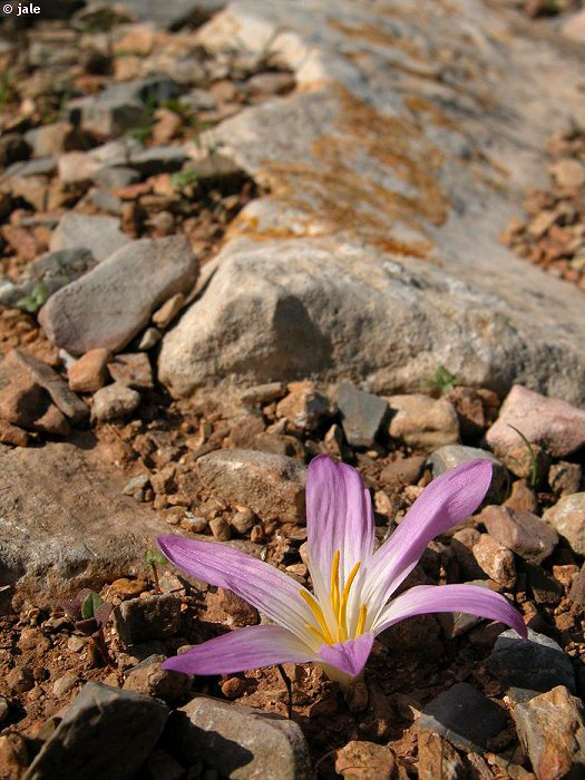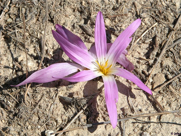 Bulbosa de hasta 10 cm de altura. Órgano subterráneo de 2-3 cm de ancho, cubierto de una túnica padusca muy oscura. Hojas lineares, de 5-7 cm de largo, muy estrechas y algo plegadas, por lo general ausentes durante la floración, a lo sumo en estado de desarrollo incipiente cuando ésta. En otoño, cada planta produce a ras del suelo una única flor, de seis piezas rosadas, blanquecinas en la base. Fruto de tipo cápsula.