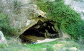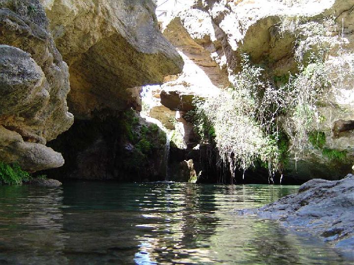 El espectacular pliegue de La Puerta. Las calizas marinas eocenas pasan de estar horizontales, a la derecha, a ponerse casi verticales. El río Alhárabe se esconde en la base de este desfiladero calizo