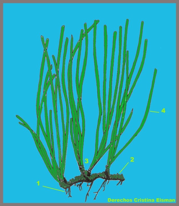 Compartir estas adaptaciones ha originado que todas las especies compartan también un semejante patrón morfológico (figura 3). Tallos tipo rizoma y por tanto enterrados en el sedimento, que pueden crecer en horizontal para colonizar nueva superficie de fondo o en vertical para evitar el enterramiento. De la parte inferior de los rizomas surgen las raíces, que además de fijar también absorben nutrientes del sustrato. De la parte superior, a partir del propio rizoma o de pequeños brotes del mismo, surgen las hojas, que son largas y acintadas y están agrupadas en haces. Son generalmente plantas dioicas y las flores son pequeñas, agrupadas en inflorescencias, poco vistosas y aparecen casi siempre en la base de las hojas. El polen es filamentoso para aumentar su flotabilidad y facilitar el transporte por las corrientes, incrementándose con ello las posibilidades de fecundación. Sin embargo, en muchas de las especies predomina la reproducción vegetativa, por medio del crecimiento clónico de los rizomas. El resultado es que dentro de sus características y densas formaciones existe interconexión física y fisiológica entre los vástagos, funcionando por ello de forma integrada.