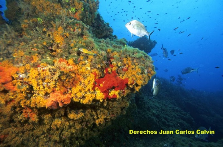 En este entorno rocoso podremos disfrutar del paisaje de rompiente (figura 3) ya lo observemos paseando por el acantilado o nadando con gafas y tubo en superficie, siendo esta última la forma de poder observarlo en los tramos costeros de acantilado vertical. Ya sumergidos, el paisaje que nos envuelve será el de roca bien iluminada (figura 1), pero si nos asomamos entre los bloques de la roca, sus paredes verticales y la grietas, cuevas, túneles y extraplomos que se han conformado al apoyarse unos bloques sobre otros, albergan los paisajes paredes verticales y cuevas, extraplomos y grietas (figura 4), aunque este último paisaje suele estar algo empobrecido en estos fondos tan superficiales.