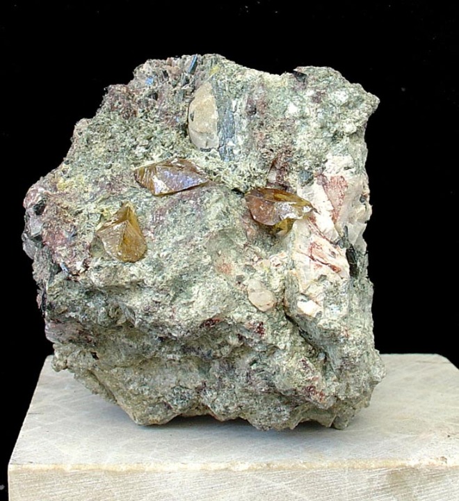 Es un mineral accesorio en rocas ígneas ácidas e intermedias (granitos, granodioritas, dioritas y sienitas), así como en algunos tipos de rocas metamórficas (gneis, esquistos y mármoles). En la región de Murcia es relativamente abundante en las mineralizaciones hidrotermales existentes en las fracturas de ofitas y metabasitas, junto con prehnita, epidota, apatito y analcima.