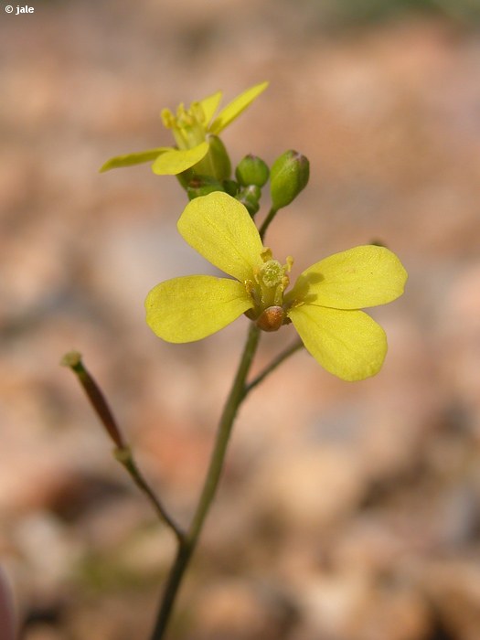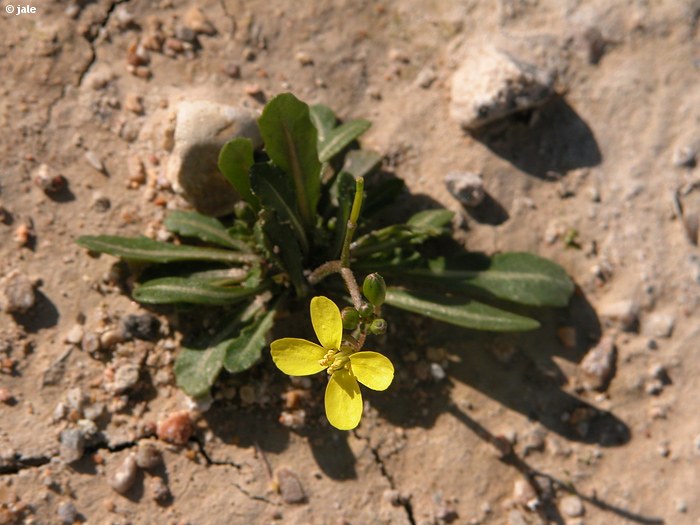 Hierba anual, erecta, de tallos por lo general no mayores de 10-15 cm, de hasta 60 cm, cubiertos de pelos, algo gruesos. Hojas distribuidas a lo largo de toda la planta, aunque más abundantes en su parte basal, a modo de roseta. Las inferiores de hasta 11 cm de largo y 2,5 cm de ancho, elípticas, algo obovadas, de enteras a dentadas, sinuadas, y con frecuencia pinnatifidas o pinnatipartidas, con hasta seis lóbulos, de margen dentado. Hojas superiores no divididas, de elípticas a lineares, de peciolo corto o sin él. Flores con pétalos amarillos, de hasta algo más de 1 cm de longitud. Frutos de tipo silicua, alargados, algo rugosos, de hasta 4 cm de largo y 2 mm de ancho.