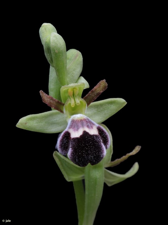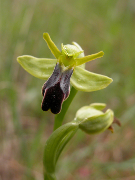 Hierba perenne, de tubérculos elipsoides. Tallos verdes, lisos, de hasta 30 cm, con roseta basal de hasta 4 hojas oblongo-lanceoladas, y hasta 3 hojas caulinares, envainantes. Inflorescencia laxa, de una a cinco flores, que asemejan a un insecto, con seis piezas, la mayor, el labelo, de hasta 15 mm de longitud, cubierto de pelos cortos, muy densos, de aspecto aterciopelado, azul oscuro, con mácula grisáceo-azulada, en forma de W. Ovario erecto, retorcido, que madura en fruto de tipo cápsula, de hasta 4 cm de longitud.