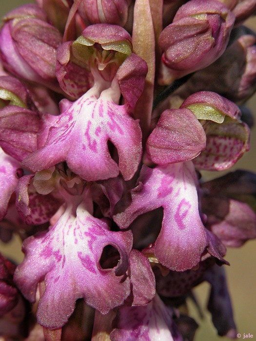 Hierba robusta, glabra, con 2-3 tuberculos, relativamente grandes. Tallos de hasta 80 cm, verdes, teñidos de púrpura en su tercio superior. Hojas mayoritariamente basales, de hasta 25 cm de longitud y 6 cm de ancho, en grupos de 4-6. Algunas, caulinares, abrazando al tallo, erectas. Inflorescencia en espiga densa, de hasta 40 cm de longitud, con numerosas flores, de 2.5-3 cm de longitud. Sépalos verdes, con manchas y trazos purpúreos en su cara interna, conniventes con los pétalos, similares, en una estructura a modo de capuchón. Labelo 15-20 mm, rosado-violáceo con manchas púrpuras, margen lobulado, lóbulos laterales falciformes, lóbulo central bífido, espolón 5-6 mm de longitud. Fruto en cápsula.