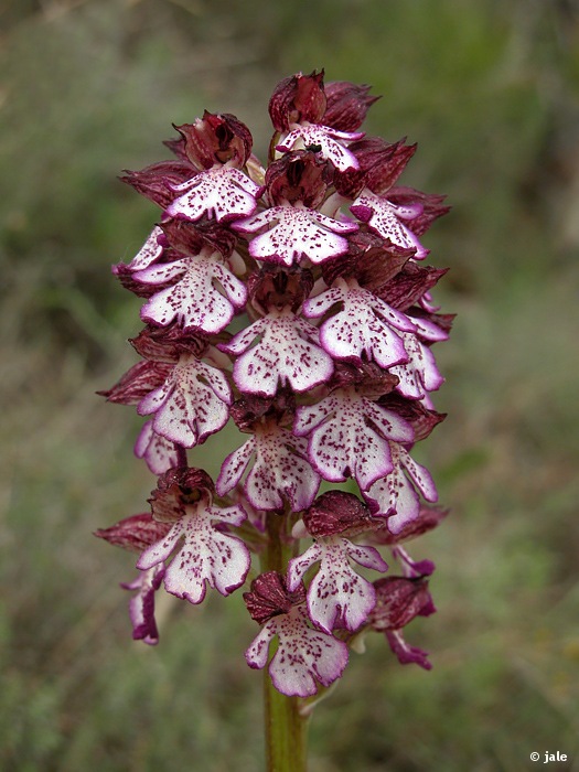 Hierba bulbosa, de tallos de hasta 80 cm de longitud, cubiertos en el tercio inferior por 4-6 hojas, de 10-15 x 4-6 cm, erectas, lanceoladas, acuminadas, las superiores de menores dimensiones, envainadoras. Inflorescencia en espiga densa, con numerosas flores, de sépalos y pétalos externos conniventes en una gálea, purpúpeos. Labelo de 12-14 mm de longitud, rosado con máculas y trazos purpúreos, de margen crenulado, trilobado, los lóbulos laterales lineares y el central cuneiforme, bilobulado, con escotadura, en la que aparece un apículo triangular. Espolón de 4 mm de longitud, curvado hacia abajo, blanco. Fruto de tipo cápsula, oblonga.