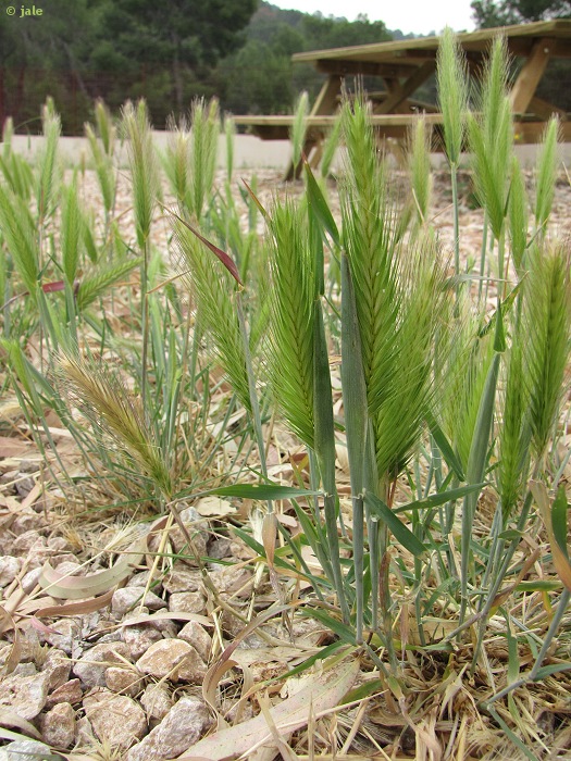 Hierba anual, de tallos erectos, lampiños, de 15-30 cm, raramente mayores de 40 cm. Hojas algo pubescentes, asperas al tacto, de hasta 25 cm de largo y 1,5 cm de ancho, con lígula truncada y vaina ciliada, de pelos largos. Espiga de 2-10 cm, densa, algo comprimida. Espiguilla central de cada grupo sésil o con pedúnculo corto, de hasta 1,5 mm. Glumas ciliadas, en los márgenes, lineares en las espiguillas laterales. Lema de hasta 10 mm, glabrescente, con arista de hasta 60 mm. Fruto de tipo cariópside.