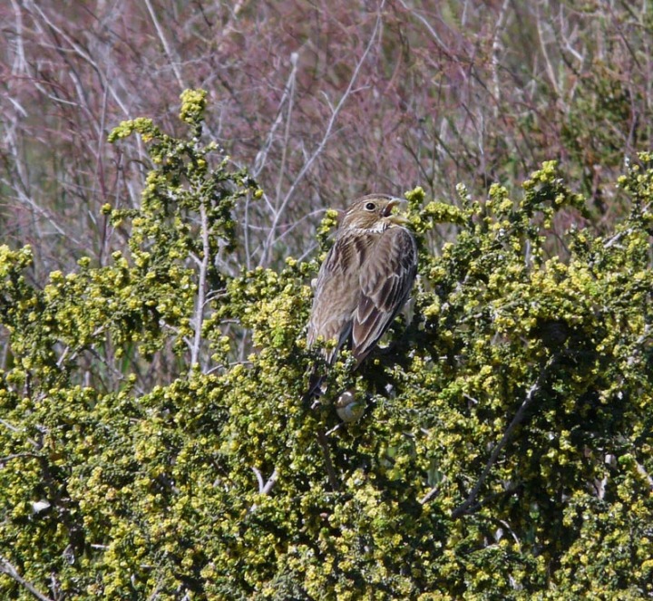 El triguero parece ser un pájaro polígamo, controlando su territorio posado en lo alto de algún poste o sobre las ramas o las hojas de un arbusto, desde donde controla el nido. En esta posición emite su característico reclamo, parecido a un mecanismo de relojería que se escacharrara, una y otra vez de forma harto monótona.