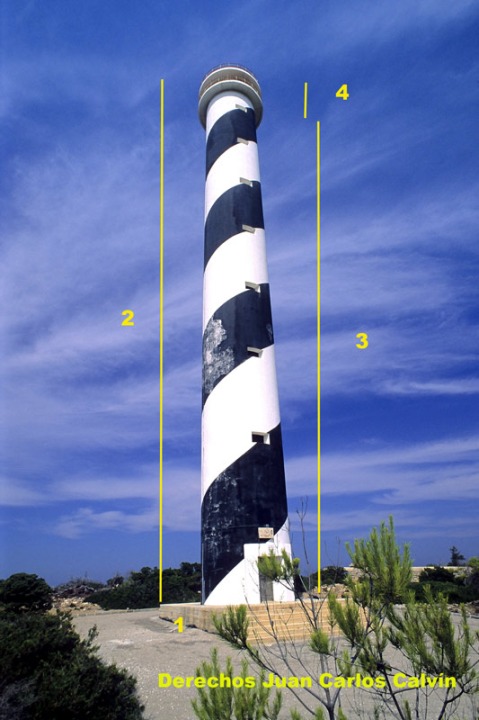 En general, la estructura de todos los faros es la misma. Constan de la torre que alberga el faro y de varias dependencias anejas, viviendas de los fareros, espacios para alojar los equipos que requiere el funcionamiento y mantenimiento del faro, etc., que se suelen reunir en un solo edificio y que suele rodear a la base de la torre. En la torre del faro se suelen distinguir tres partes: base, torre y linterna. La base es el elemento de apoyo sobre el terreno, es la de mayor diámetro y suele alojar equipos auxiliares como cuadros o grupos electrógenos. Por su parte, la torre consta de fuste y torreón con cámara de servicio (figura 1). El fuste constituye el cuerpo de la torre, y el torreón, con la cámara de servicio, constituye la parte superior de la misma. La torre tiene una escalera de caracol interna para ascender a la cámara de servicio, en la que los fareros atendían todas las maniobras que requería el funcionamiento del faro, que hoy en día se han simplificado mucho con su automatización. La cámara de servicio suele tener un balconcillo exterior. Desde éste, una escalera de mayor pendiente conduce, por medio de una trampilla que se puede cerrar, a la cámara de iluminación, en la que está instalada la óptica, y que esta cubierta por la linterna. La linterna es el cerramiento de cristal y metal que protege la luz del faro y que está situada en la parte superior de la torre. Puede tener rodeándola otro balconcillo exterior para facilitar su limpieza (figura 2).