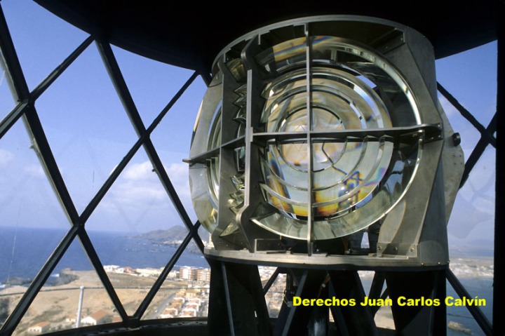 El alcance actual se ha conseguido gracias al conjunto de lentes catadióptricas acrílicas que están colocadas alrededor de la fuente de luz como los lados de un polígono regular, y que forman el característico sistema óptico de los faros (figura 3). Por su parte, este conjunto está situado sobre un carro circular que, sustentado sobre un flotador de mercurio que reduce el rozamiento, es impulsado por una maquinaria de relojería. Este conjunto giratorio ha permitido el sistema de destellos y ocultaciones con el que actualmente se identifican los faros y se diferencian entre sí.