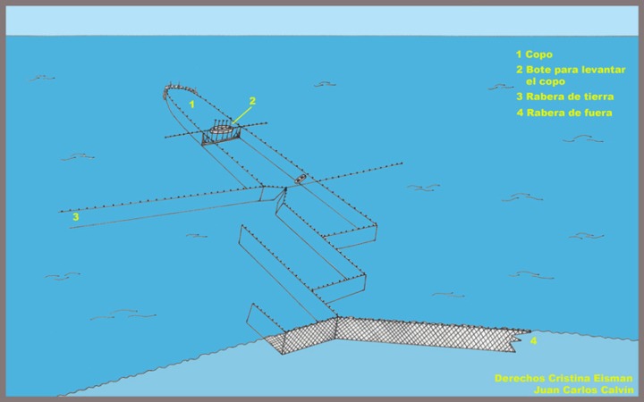 Los peces son conducidos hacia la boca del cuadro por las raberas, cuyo diseño y montaje hace difícil que puedan escapar.