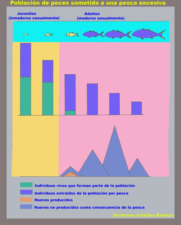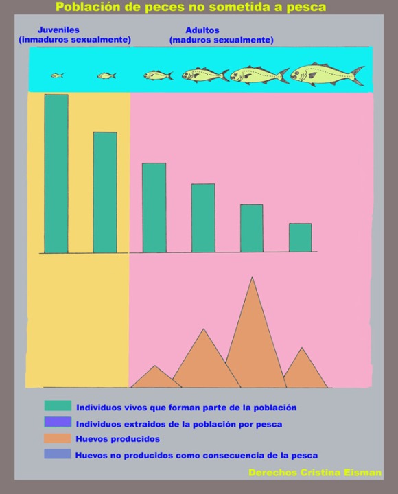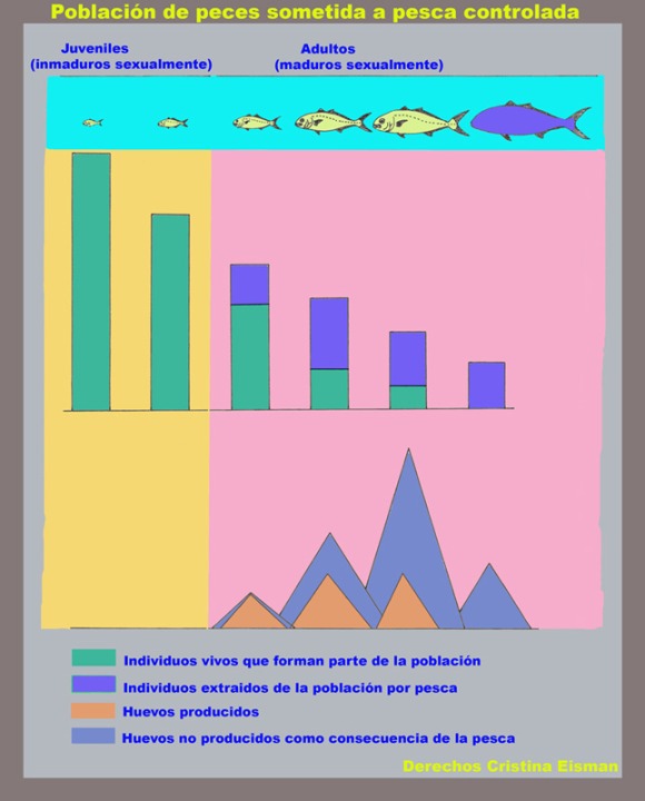 En esta situación de pesca controlada, la perpetuación de la especie está asegurada por el número aún suficiente de reproductores dentro de la población, pero el patrimonio genético (huevos producidos) de la especie habrá disminuido de forma considerable, al ser los reproductores bastantes menos y las edades más productivas las más escasas. Es decir, la muerte por pesca cambia la cantidad y calidad de los huevos producidos por la especie y, con ello, las probabilidades de la especie de perdurar en el tiempo (figura 2).