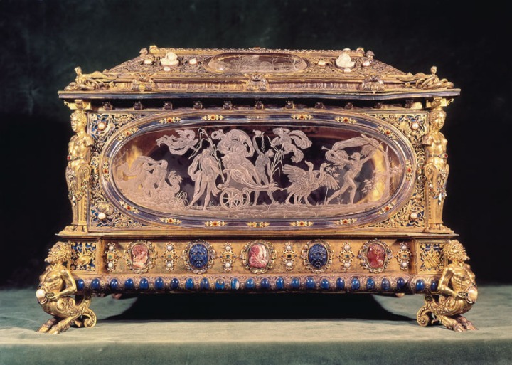Un objeto tan preciado requería a su vez un receptáculo magnífico. La arqueta de Isabel Clara Eugenia era una pieza suntuaria de tocador, un joyero hecho en 1585 en un taller milanés donde lo adquirió su hermana Catalina Micaela. Donado a El Escorial en 1593 fue utilizado temporalmente como relicario de la cabeza de San Hermenegildo hasta que el rey Felipe II encargó un nuevo recipiente para ella que reproducía la basílica de San Marcos de Venecia. La obra es una de las grandes piezas de la orfebrería europea, relacionada con distintos artífices a los que se considera autores de una joya tan eminente. La belleza de la obra reside en su aspecto fantástico, en la labra suntuosa, en la presencia de camafeos romanos, piedras preciosas, jaspes, jade, lapislázuli y otros detalles ornamentales como el cristal tallado por Anibale Fontana o las cariátides y atlantes angulares.