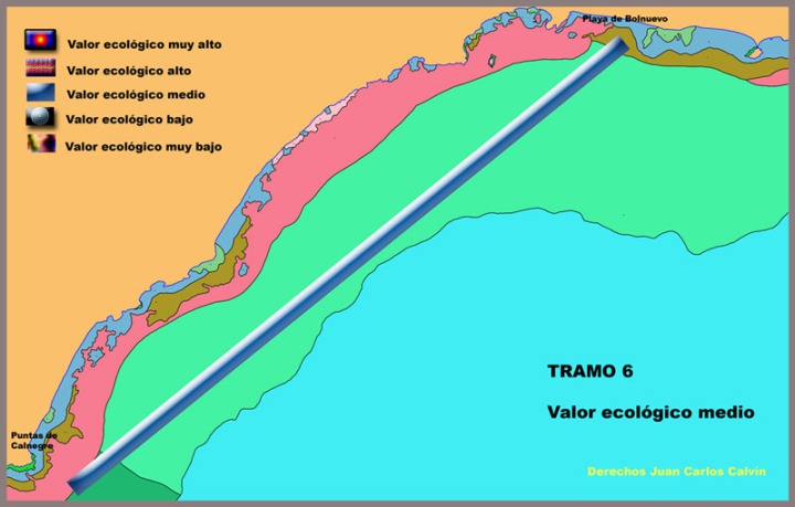 Es un tramo de costa donde se alternan playas más o menos largas con acantilados no muy altos pero caprichosamente erosionados, todo ello de una alta belleza paisajística. Los acantilados profundizan poco en el medio marino (3-12 m) y dan paso a fondos blandos que ganan profundidad suavemente.