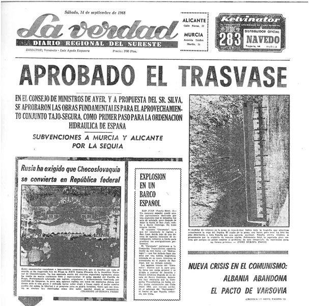 El Gobierno aprobaba la construcción del Trasvase, con la finalidad de enviar el agua excedentaria de la cabecera del Tajo a la cuenca del río Segura, el 13 de septiembre de 1968.