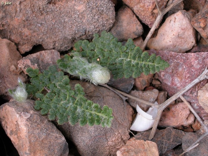 Pequeño helecho con rizoma corto, de escamas (páleas) rojizas. Frondes en grupos, con lámina dos veces pinnada, lanceolada, mucho más larga que el peciolo, castaño, ligeramente rojizo, cubierto de pelos lanosos, caedizos. Pinnulas de ovadas a suborbiculares, a veces enteras o lobadas, con pelos lanosos blancos o algo rojizos. Esporas diminutas, agrupadas en esporangios, alineados en varias filas, sobre los nervios de las pinnulas, no protegidos por indusio sino por pelos lanosos.