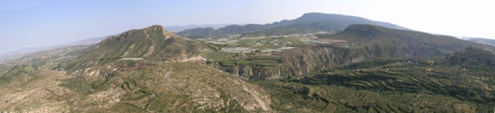 De izquierda a derecha se divisan los siguientes relieves: La Sierrecica, que forma una mesa típica coronada por rocas duras, calcarenitas; el Monte Villar, también denominado Cabezo de Cimbra, originado por un pliegue antiforme cuyo eje tiene una dirección e inclinación hacia el noreste; al fondo la sierra de La Tercia, separada del anterior por la rambla de Lébor. En el centro del paisaje existe una depresión margosa donde se sitúa la pedanía abandonada de Carivete, depresión mayoritariamente cultivada por parrales que dan la excepcional uva de Aledo. También se pueden observar fenómenos de abarrancamientos que parten de la Rambla de Los Molinos y continúan a ambos lados de La Sierrecica. Hacia el norte se puede apreciar el parque regional de Sierra Espuña, de la cual parte uno de los mejores glacis de la región, el Llano de la Cabras. Bajo nuestro pies existen numerosas terrazas de cultivo abandonadas, donde hay que estar atentos pues, muy comúnmente, por ellas deambulan los arruis, y siempre es gratificante observarlos.