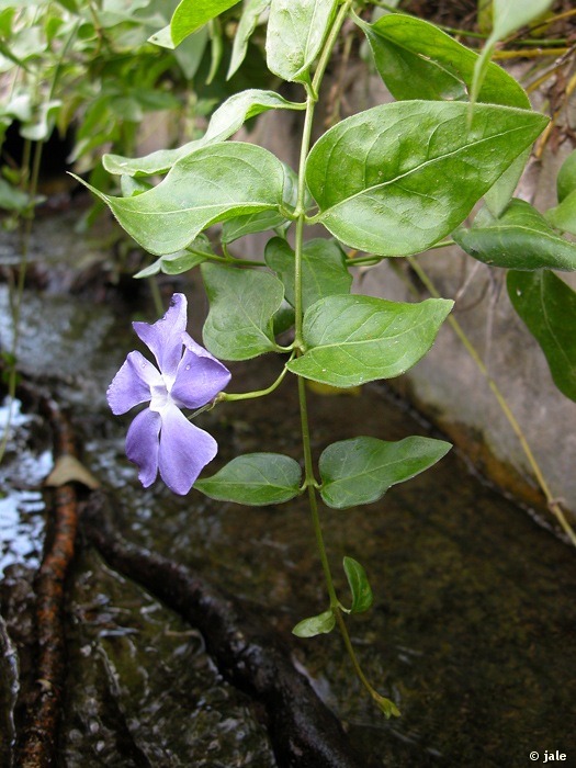 Hierba perenne, postrada, algo leñosa en la base, glabra. Tallos algo rojizos, decumbentes, salvo los floríferos, que son ascendentes. Hojas opuestas, ovadas, a veces algo lanceoladas, de margen entero y hasta 8 cm de diámetro, obtusas o subagudas en su extremo. Flores azules, solitarias, axilares, largamente pedunculadas. Cáliz con sépalos lineares y corola de cinco piezas soldadas en un tubo por la base. Fruto en folículo doble, de hasta 5 cm de longitud.