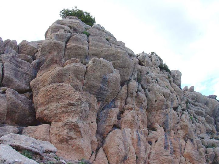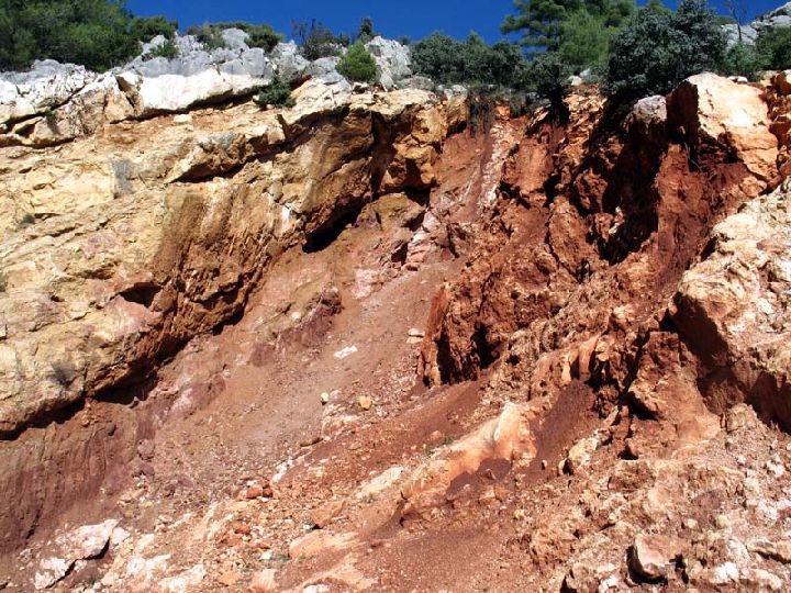 Desde este camino, mirando al norte, pronto observaremos una zona de color rojo, que nos marca el denominado Cejo de la Grieta (el yacimiento de bauxitas), al que accederemos tras recorrer algo más de un kilómetro, por un camino que parte a la izquierda del principal. Una vez en el yacimiento de bauxitas podremos observar éste y las calizas del Jurásico inferior (Lías) donde se encuentra enclavado este afloramiento. Se trata de calizas masivas, a veces parcialmente recristalizadas y calizas con crinoides, lamelibranquios, gasterópodos, belemnites y oolitos, que nos informan del origen marino de las mismas y de su formación bajo un clima cálido. Lo que contrasta con la formación de las bauxitas por una posterior emersión de la zona y por la karstificación de las calizas, que originó numerosas depresiones y cavidades de potencia métrica a decamétrica, antiguas dolinas y simas, rellenas por colapsos y/o depósitos de bauxitas. Un verdadero y magnífico karst del Jurásico.