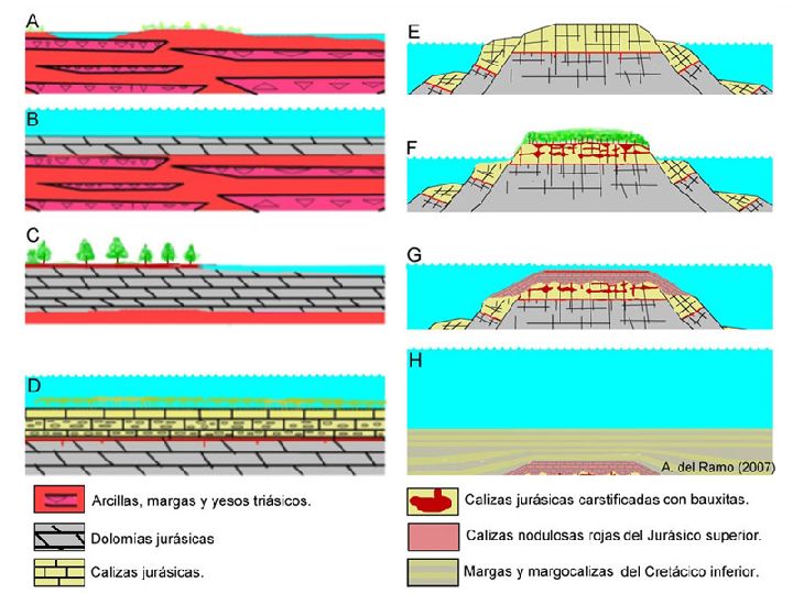 Posteriormente esta plataforma submarina del Lías inferior se transformó (figura 2-E) en un umbral emergido, en una isla alejada del continente (de la actual Meseta), bajo la influencia de un clima intertropical, que desencadenó un intenso proceso de karstificación de sus rocas carbonatadas. Situación que duró unos 40 Ma, hasta principios del Jurásico superior. La isla a la que dio lugar, podemos imaginarla como una superficie plana, cubierta por abundante vegetación, favorecida por un clima lluvioso (1.000-2.000 mm) y cálido (27ºC) y bordeada por taludes abruptos y escalonados que conectaban con fosas submarinas (figura 2-F).