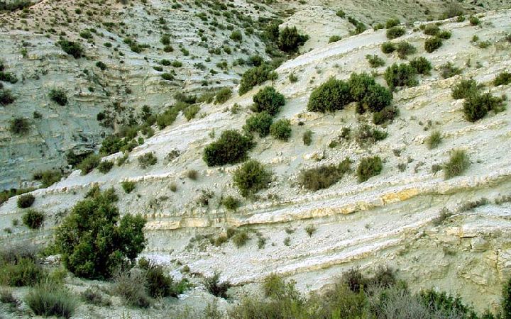Visto el poblado seguiremos el camino principal que transcurre entre las calcarenitas y margas terciarias hasta la superficie de contacto entre éstas y las calizas jurásicas. En esta superficie podremos observar como las calizas fueron perforadas por dátiles de mar (Litophaga sp.) hace unos 10 Ma., cuando la zona formaba parte de una bahía y sobre ellas los restos de diversos moluscos marinos. Con un poco de suerte veremos algún belemnites o ammonites en las calizas jurásicas.