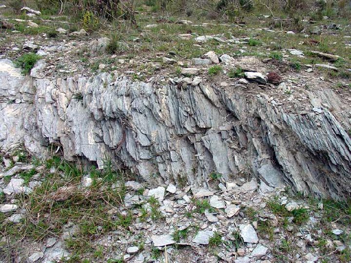 En primer lugar, al pie de la montaña, podemos ver los esquistos y cuarcitas triásicas que constituyen las rocas caja por donde ascendió el magma. Se puede observar en ellas la foliación y la deformación típica de las rocas metamórficas presentes en los alrededores.