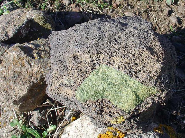 Xenolitos de peridotitas. Se trata de lhezolitas que destacan por su color verde oliva debido a la abundante presencia de olivino rico en magnesio (forsterita), aunque, debido a la rápida alteración de este mineral en muchos casos aparecen con tonos rojizos (iddingsita) o amarillentos. Junto al olivino, forman la lherzolita, piroxenos y espinela.