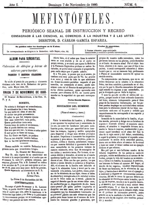 Hubo que esperar casi una década para que volviera a existir actividad periodística en La Unión. El 3 de octubre de 1880 apareció el primer número de Mefistófeles, un periódico semanal “de instrucción y recreo consagrado a las ciencias, al comercio, a la industria y a las artes”. Se componía esencialmente de extensos artículos intemporales de contenido literario e histórico y de noticias locales. Mefistófeles editó su último el número el 27 de marzo de 1881. Según su director, Carlos García Esparza, la causa de la desaparición del semanario se debió a que no recibió ayuda de otras personas para seguir adelante con su publicación.