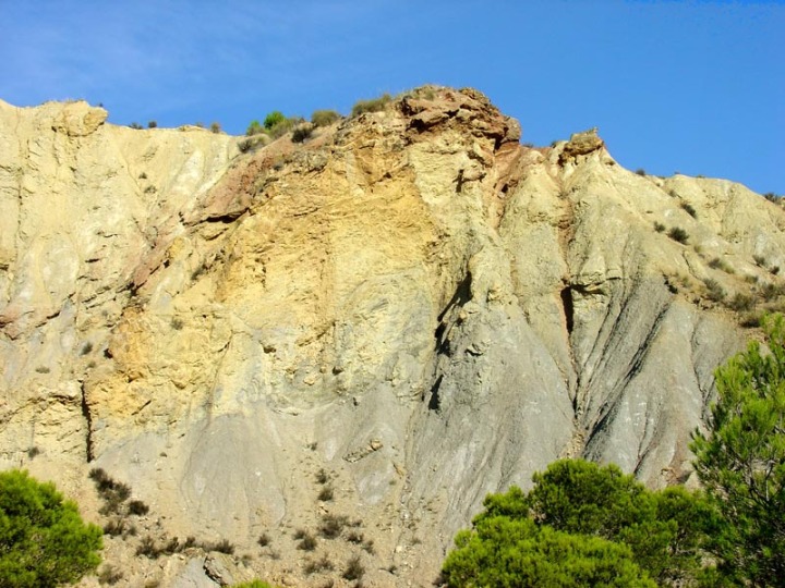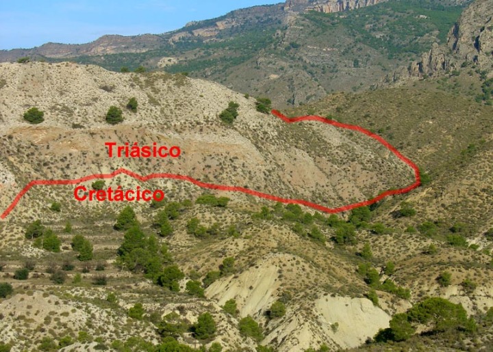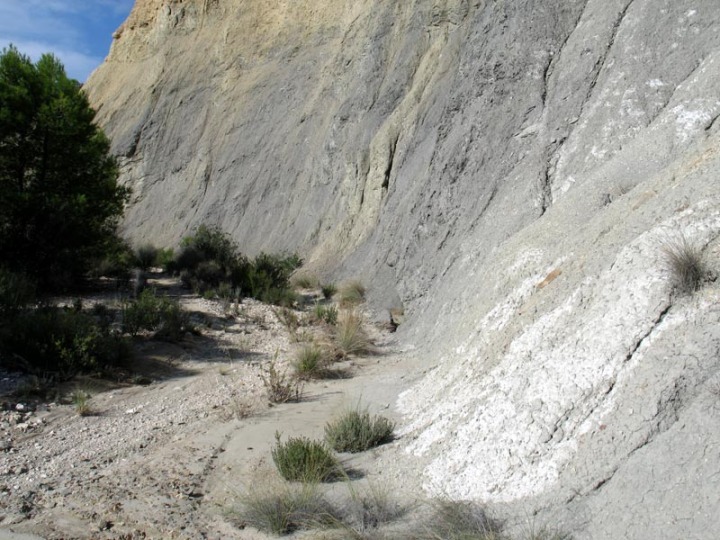 Cuando acaba el asfalto el camino atraviesa un afloramiento de arcillas, yesos y dolomías. A la derecha se observan pequeñas canteras en los yesos, que realizaron los aledaños. Estos yesos y dolomías son los restos de antiguas salinas costeras, que ocuparon gran parte de la región hace unos 225 millones de años cuando comenzó a fragmentarse el Pangea. Estos yesos y dolomías también representan la base del cabalgamiento subbético, sobre los materiales cretácicos prebéticos, habiéndose desplazado sobre éstos últimos materiales algunas decenas de kilómetros, durante la orogenia Alpina, cuyo resultado en el sureste español es la formación de la cordillera Bética.