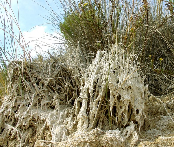 Siguiendo unos 200 metros por el camino, encontramos otro camino a la izquierda que va paralelo a la rambla del Salar, que nos lleva a una formación de travertinos activa actualmente, mostrándonos como se originan este tipo de rocas, al precipitar la cal de las aguas subterráneas, que afloran a la superficie, sobre la vegetación existente.