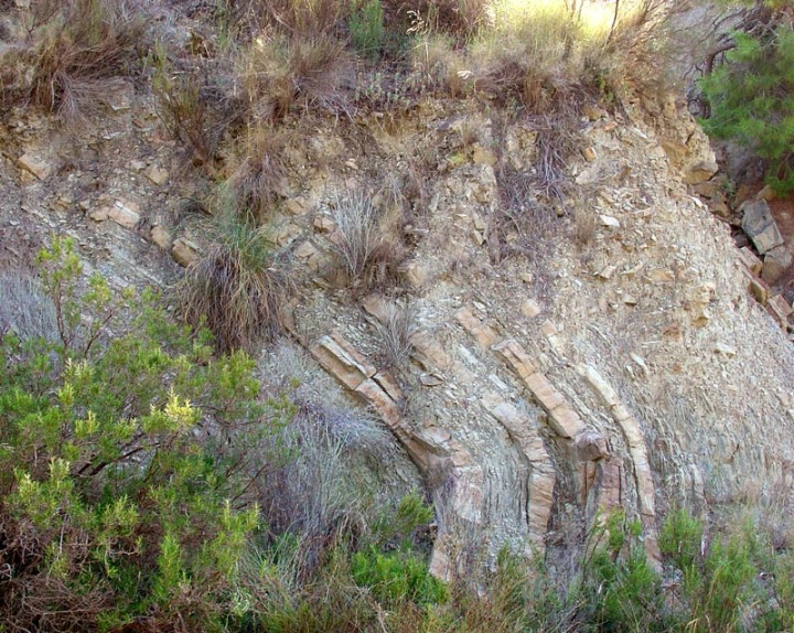 Continuando por el camino que accede al cauce, justo antes de llegar al mismo, podemos observar en su pared norte una serie de replegamientos muy dislocados y caóticos que chocan contra unas margas muy oscuras; se trata de un pliegue intraformacional (slumping) originado por un paleodeslizamiento acaecido durante el Cretácico inferior. Continuando aguas abajo o arriba como viene marcado en el itinerario, apreciamos nuevos repliegues en rocas areniscosas que aparecen embutidos en las margas oscuras, así como otros pliegues en sentido estricto, estrías de falla y diversas geoformas generadas en épocas recientes por las aguas de escorrentía (cárcavas, erosiones laminares, barras de conglomerados, antiguas terrazas fluviales, etc.).